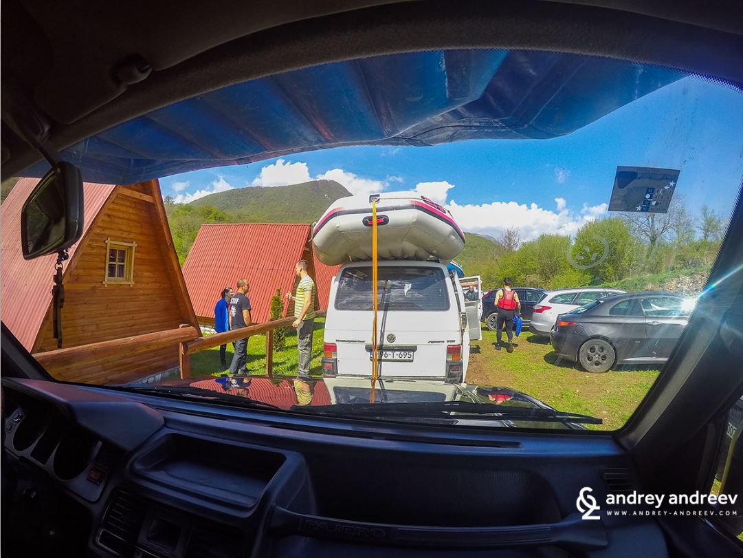 On groups by 7 we hoped on the Jeeps. The engines started with the typical roaring sound preparing us for what was coming next. In about 20 minutes of a bumpy ride we stopped in what seemed like a traffic jam in the middle of the mountain. Turned out that this is the Bosnian – Montenegro border. We crossed it dressed in the tight neoprenes, looking like the seal from Tom & Jerry. Right after the barrier the jeep made a U-turn and headed back to the direction we just came from. What was going on?!? Didn’t they let us pass the border?!? Are we not going rafting?